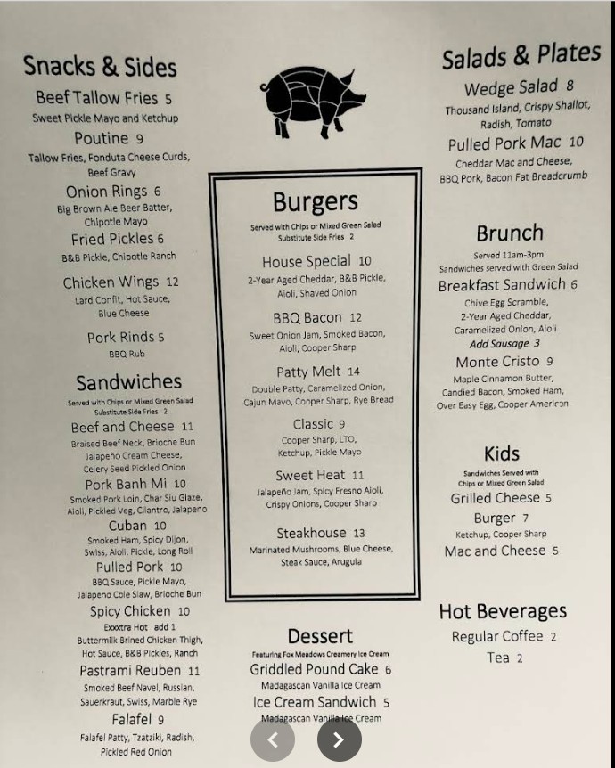 Fantastic small local owned place to get a bite to eat. They serve local beer and soda . They have good sandwiches and other plates. You can also get fresh cut aged meats to go. Street parking or there is a lot in the back. There is additional seating upstairs along with a play kitchen for kids (pictured) and a little lookout over the kitchen.
